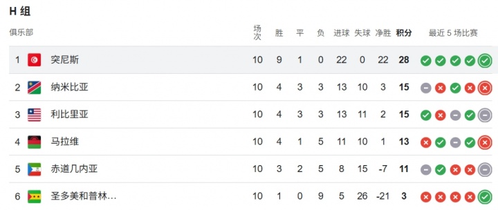Bảng H vòng bảng khu vực châu Phi của vòng sơ loại World Cup đã kết thúc hôm nay. Chung cuộc, Tunisia đứng nhất bảng với 28 điểm sau 10 trận, ghi 22 bàn và để thủng lưới 0 bàn.